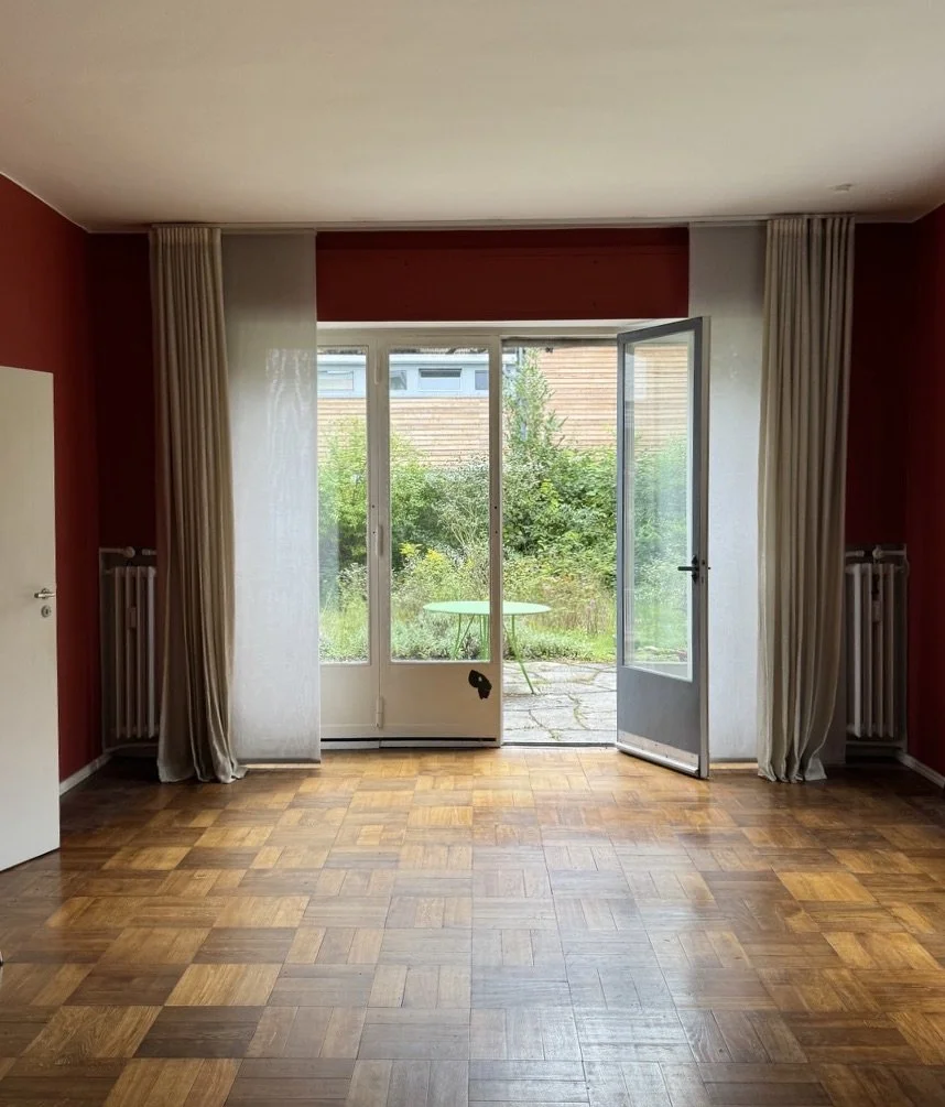 Key features include flush-mounted steel windows, flat roofs, roof and garden terraces, and a strong orientation toward sunlight, all of which reflect the principles of Neues Bauen. Making deliberate use of the site’s topography, Behrens embedded the elongated structure into the terrain, creating a raised basement on the street side. This level accommodates the entrance to the auxiliary apartment as well as two garages. As a result, the living spaces of both apartments open at ground level directly onto the garden through wide glazed doors.