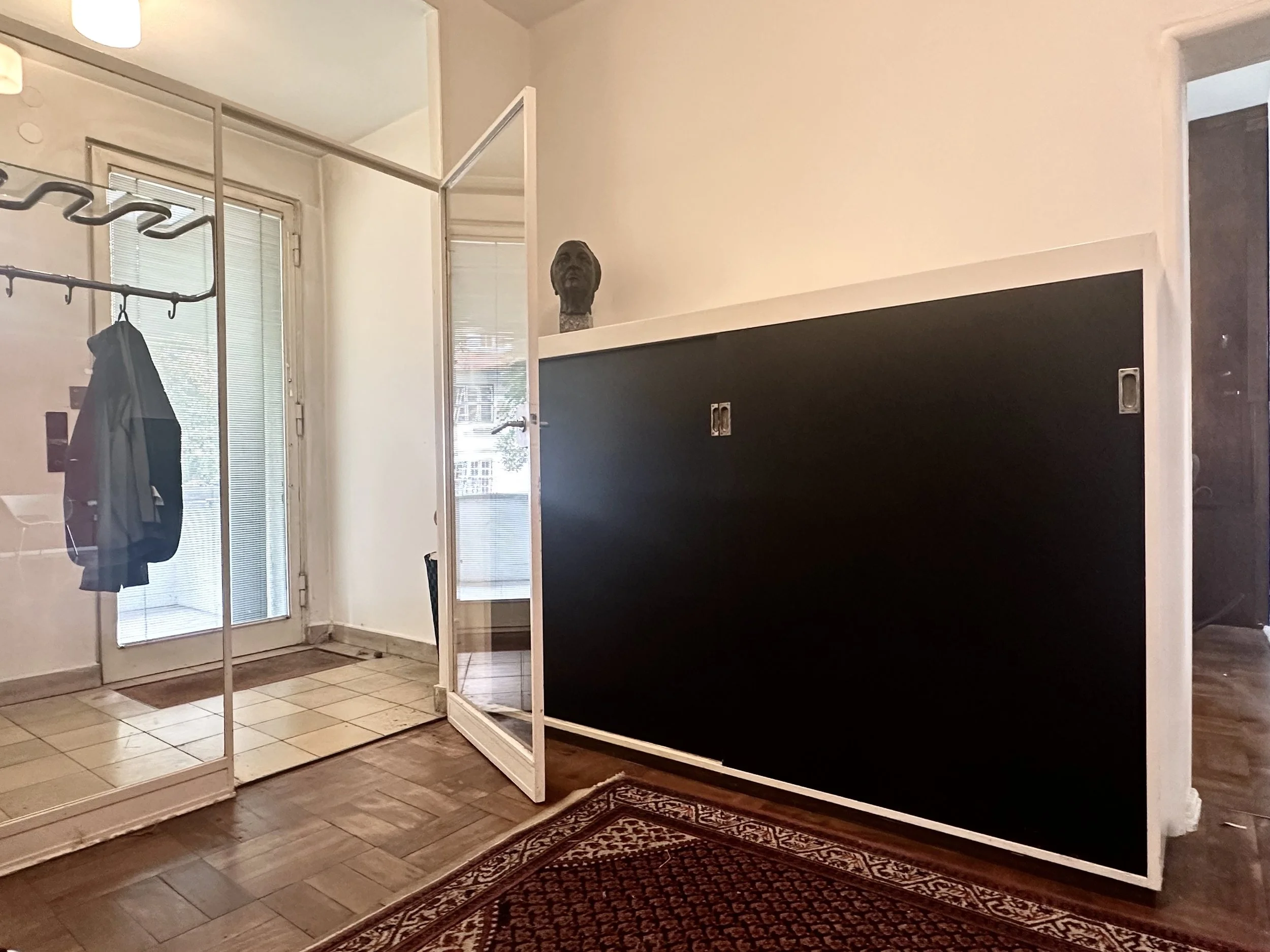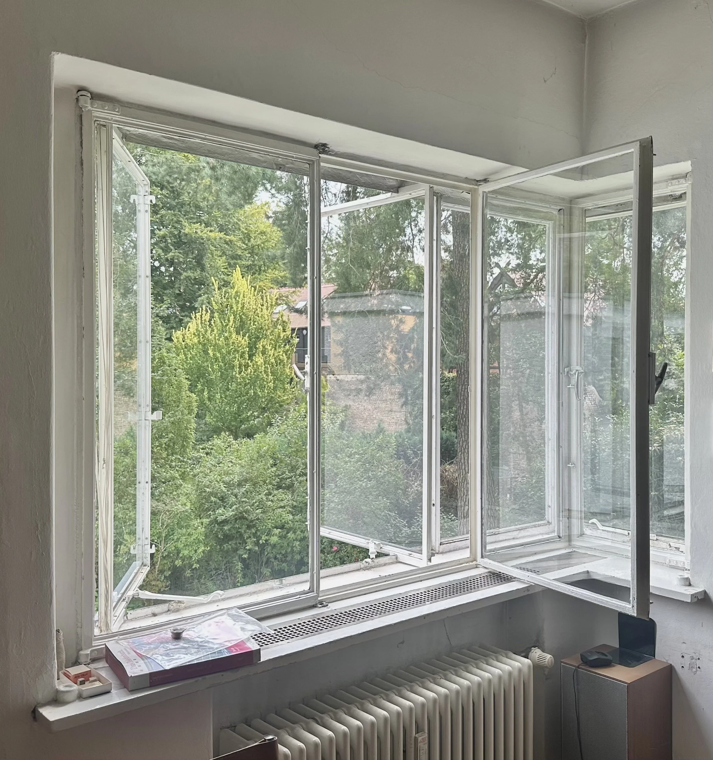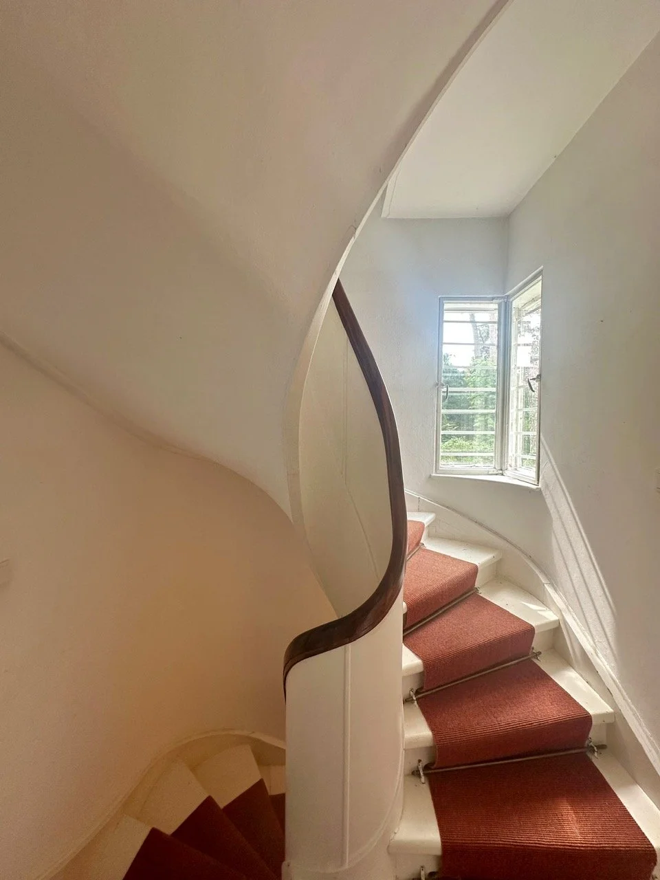Today, the original walnut parquet floors remain in use and in good condition, showing only signs of age-appropriate patina. Numerous built-in furnishings, ceiling lamps, and other original fixtures by Marcel Breuer are still intact, as is the solid wood library in the study. The living room features a distinctive semicircular window facing the street, an unusual Bauhaus-era detail and a notable architectural feature.