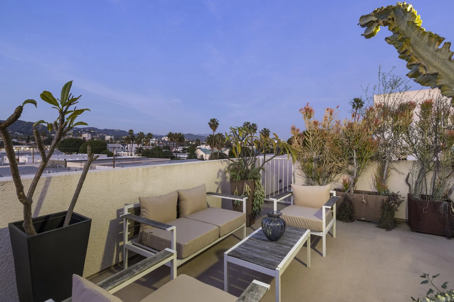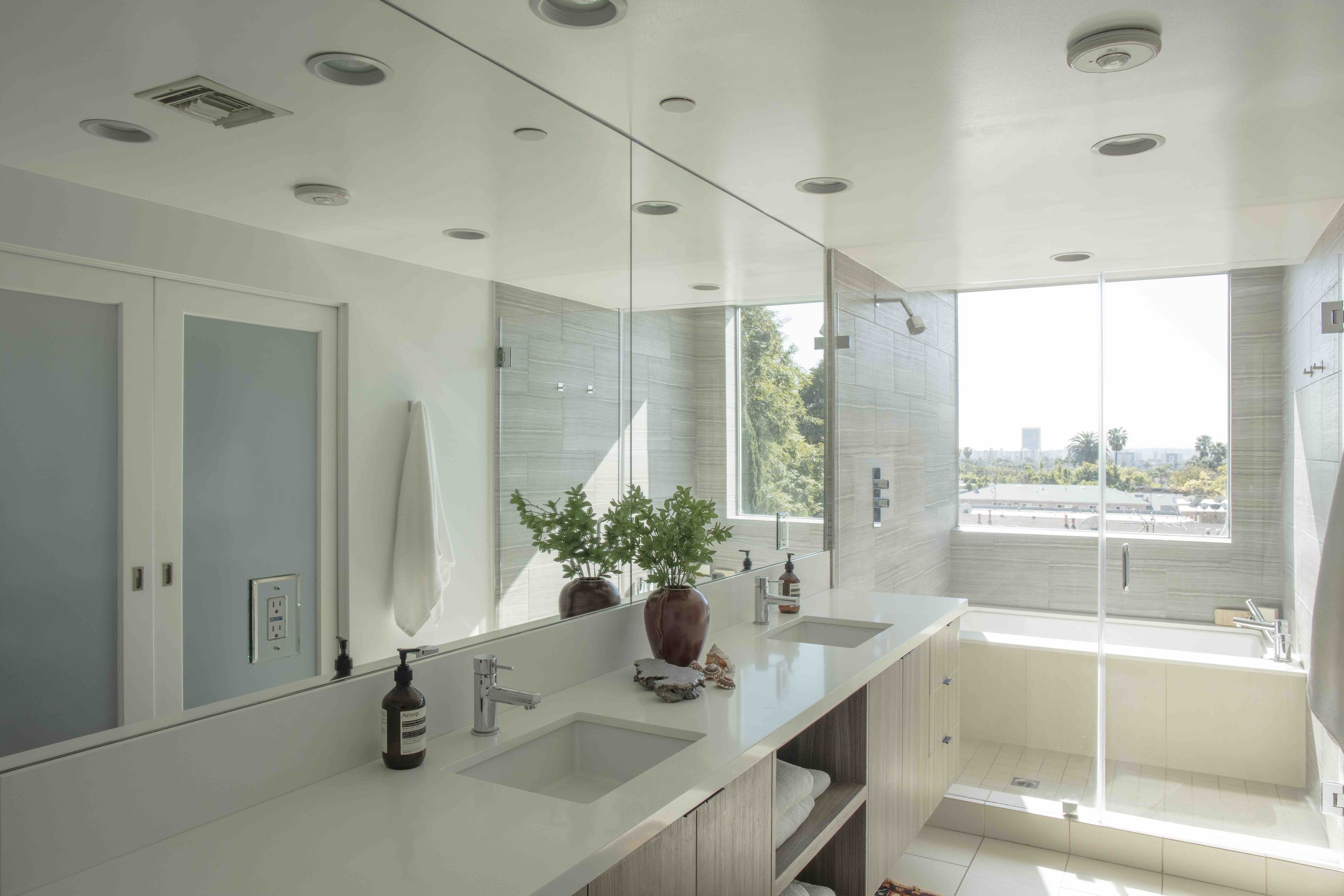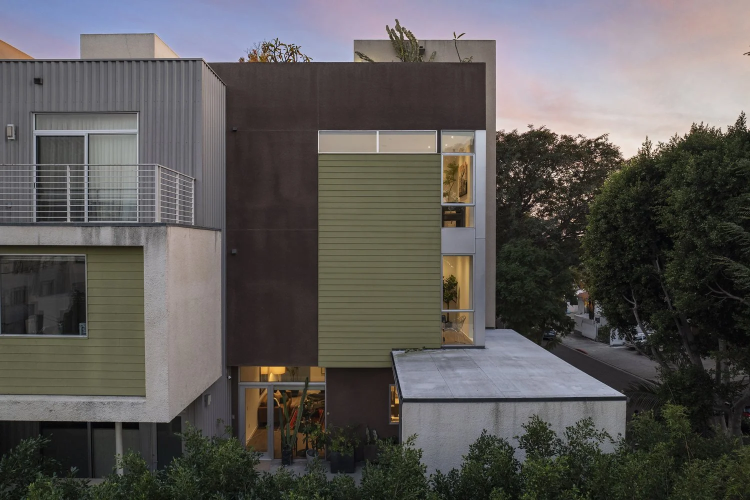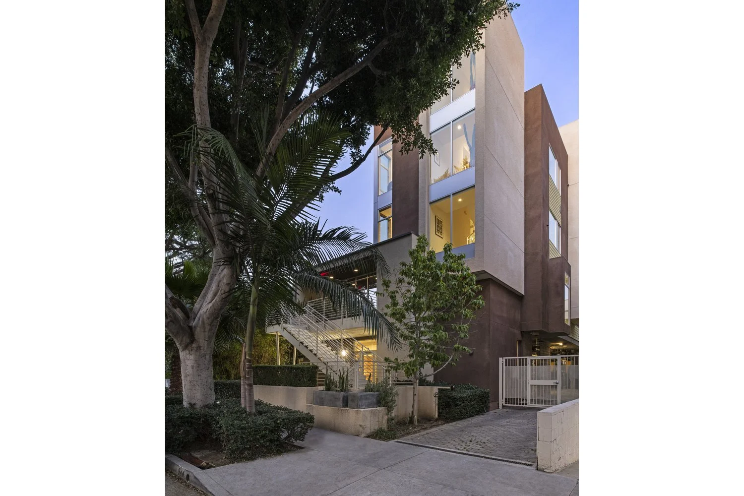 This unique architectural townhouse is the first unit at the corner of a five-unit contemporary building in a prime West Hollywood location between Melrose Avenue and Santa Monica Boulevard, close to shops, dining, and daily amenities. Visible as a vertical glass tower above street level, it defines the front facade and brings natural light through the staircase into the different levels. Mature trees surround the building and create privacy as well as treehouse-like outlooks from the corner bedroom windows. The home offers four levels of interior living space and includes a roof terrace with panoramic views toward the Hollywood Sign, Griffith Observatory, and the city. The main entrance is located on the second level behind a gated patio that opens directly into the living room and kitchen, creating a seamless indoor-outdoor transition. Two primary suites on the third and fourth level, each featuring spa-style bathrooms and walk-in closets, are flooded with light. An additional bedroom and full bathroom are located on the first level and can be accessed either internally from the living space or directly from the exterior, allowing flexibility for use as a guest suite, office, or studio. Custom built-in cabinetry enhances the functionality of the space. Additional features include an in-unit washer and dryer, central heating and air conditioning, European appliances, Caesarstone countertops, two side-by-side parking spaces, and extra storage space in a gated garage.