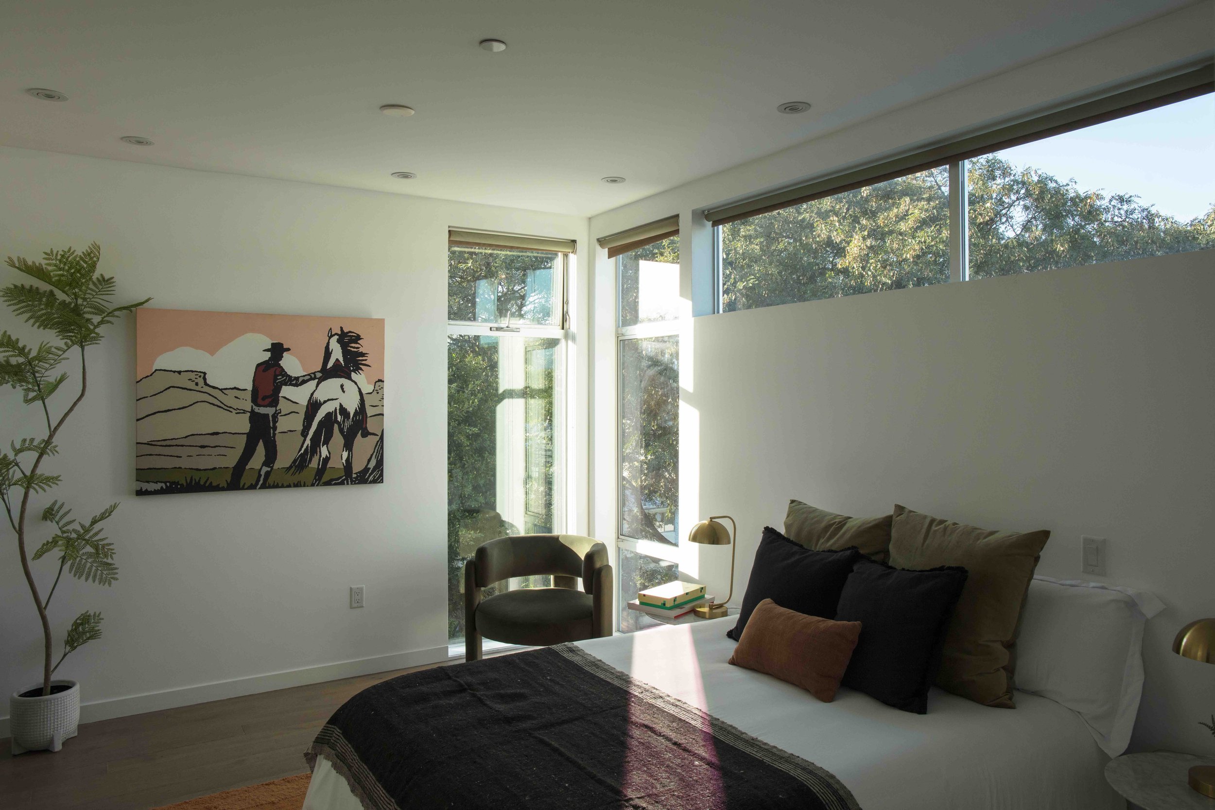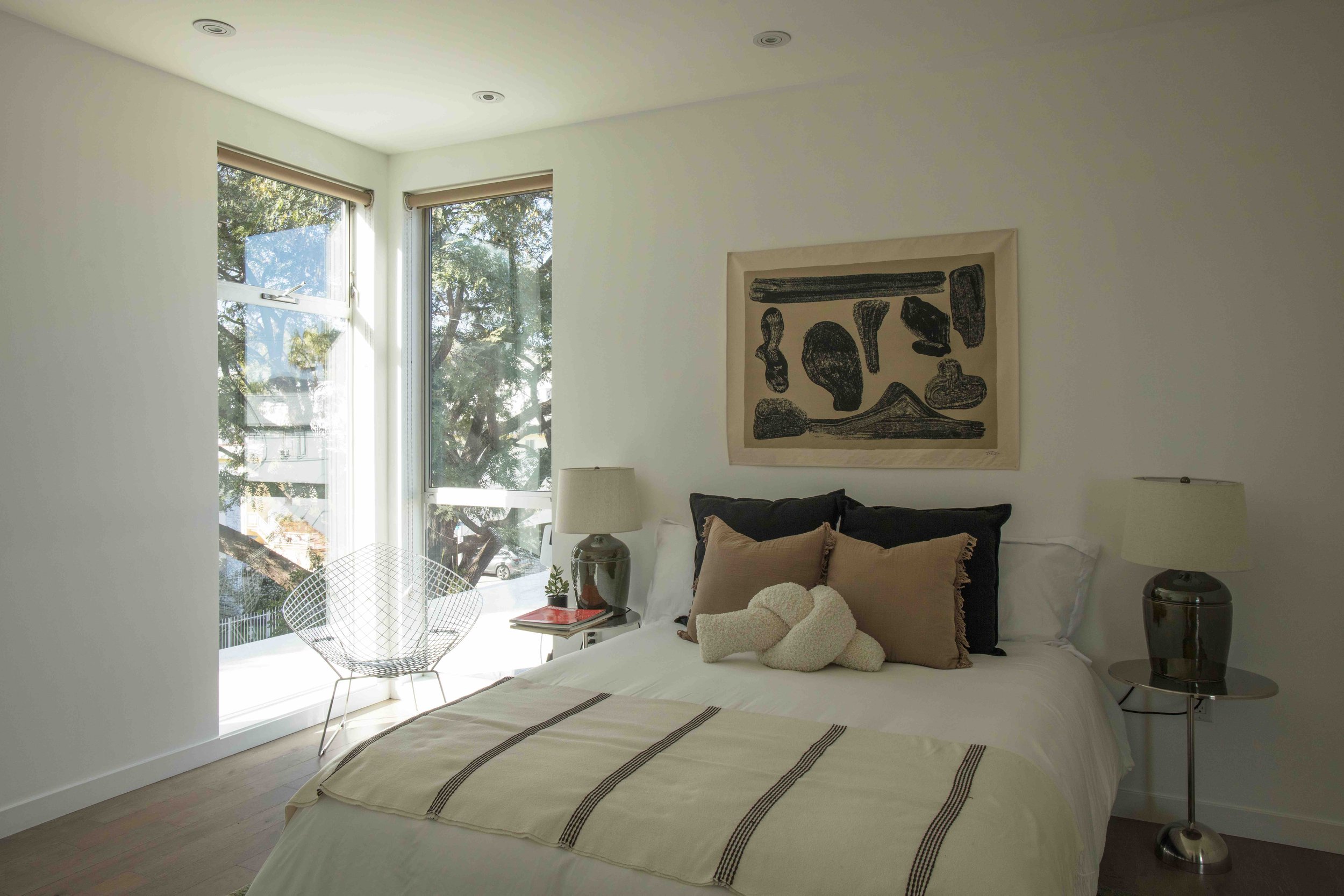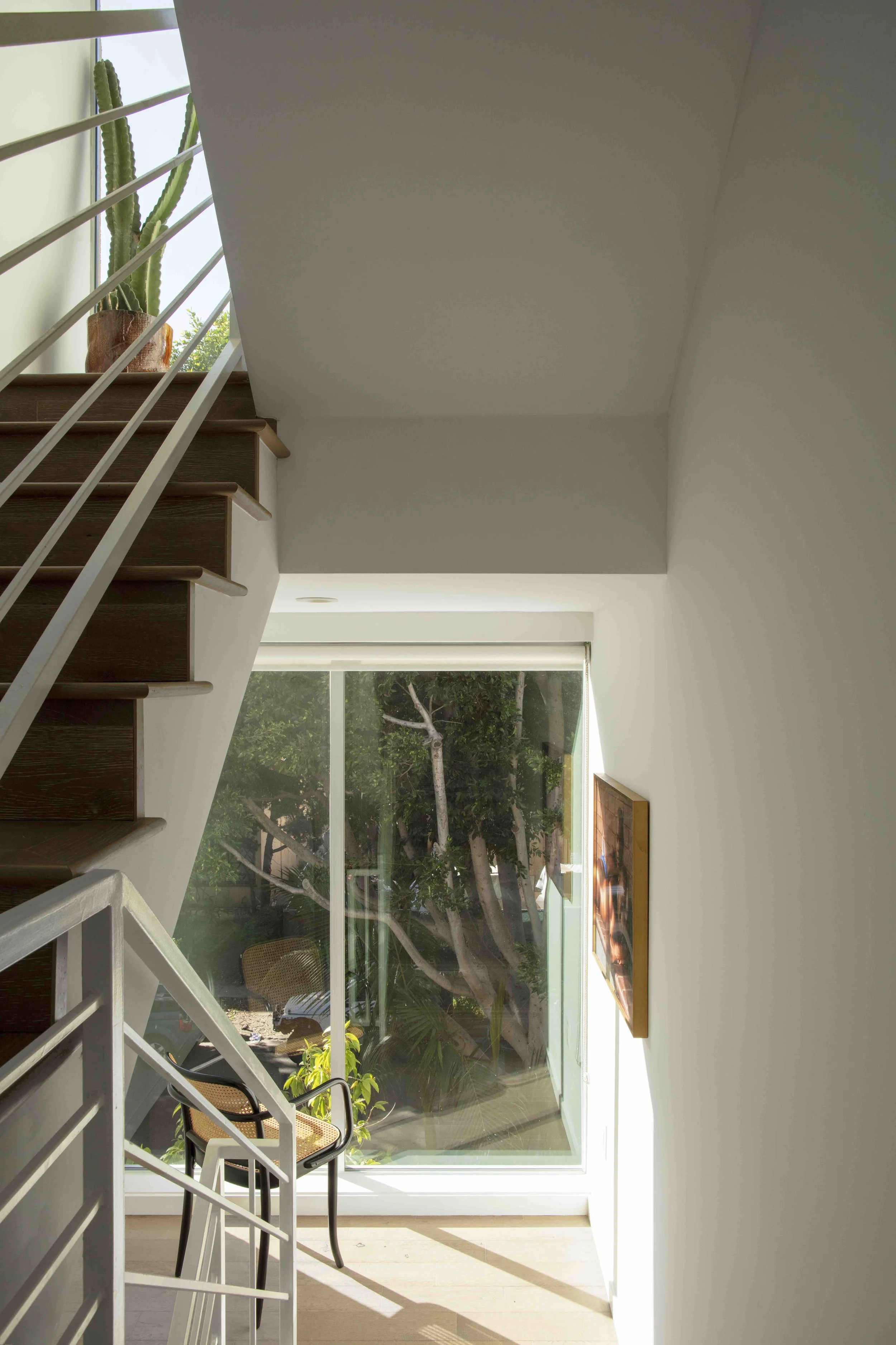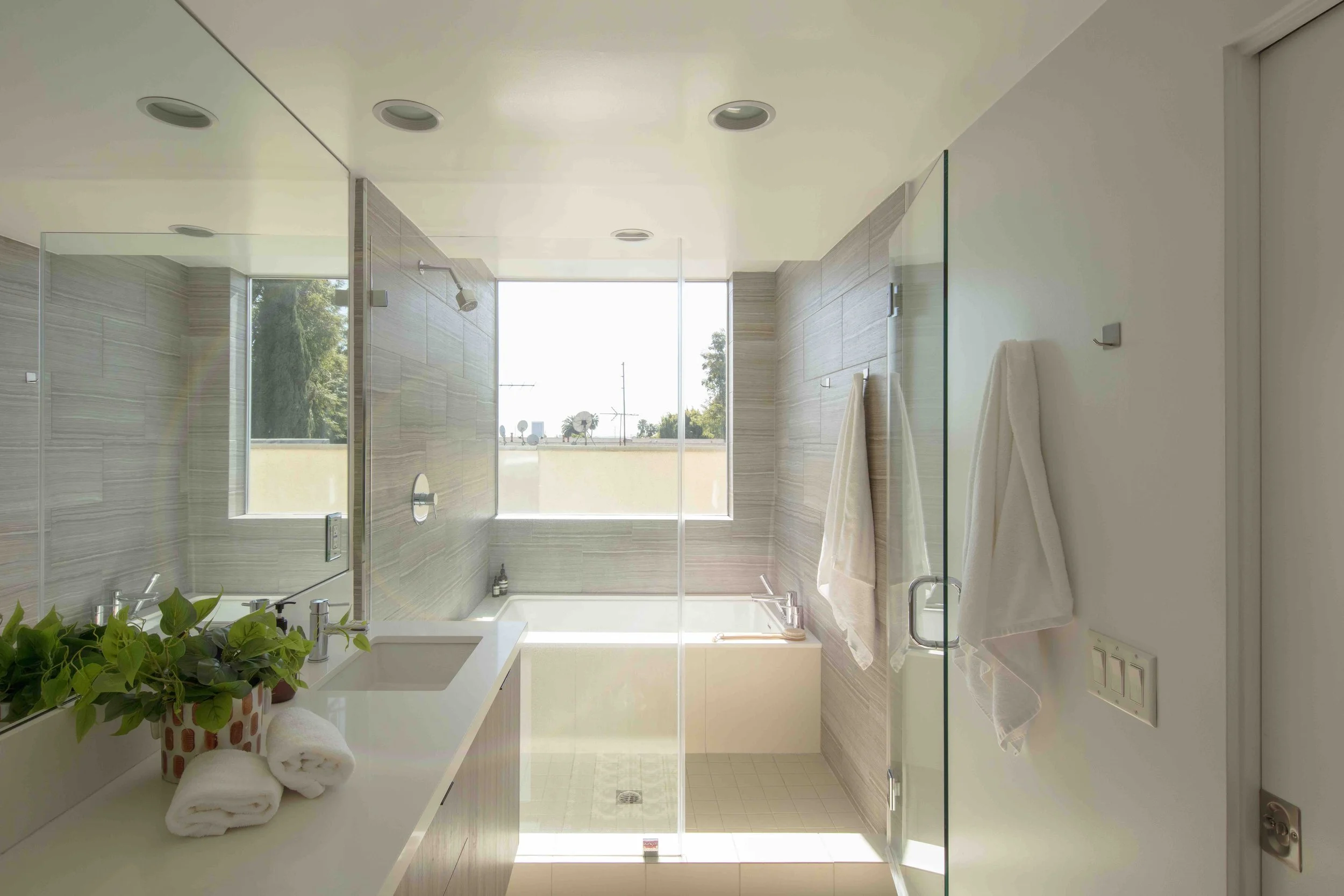 This unique architectural townhouse is the first unit at the corner of a five-unit contemporary building in a prime West Hollywood location between Melrose Avenue and Santa Monica Boulevard, close to shops, dining, and daily amenities. Visible as a vertical glass tower above street level, it defines the front facade and brings natural light through the staircase into the different levels. Mature trees surround the building and create privacy as well as treehouse-like outlooks from the corner bedroom windows. The home offers four levels of interior living space and includes a roof terrace with panoramic views toward the Hollywood Sign, Griffith Observatory, and the city. The main entrance is located on the second level behind a gated patio that opens directly into the living room and kitchen, creating a seamless indoor-outdoor transition. Two primary suites on the third and fourth level, each featuring spa-style bathrooms and walk-in closets, are flooded with light. An additional bedroom and full bathroom are located on the first level and can be accessed either internally from the living space or directly from the exterior, allowing flexibility for use as a guest suite, office, or studio. Custom built-in cabinetry enhances the functionality of the space. Additional features include an in-unit washer and dryer, central heating and air conditioning, European appliances, Caesarstone countertops, two side-by-side parking spaces, and extra storage space in a gated garage.